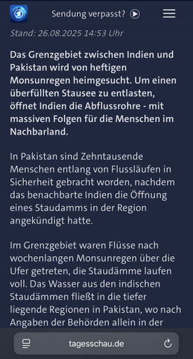 In der Presse war am 26.08.2025 zu lesen, dass die Abflüsse eines Staudamms in Indien geöffnet werden müssen, was schwerwiegende Folgen für Pakistan hat.